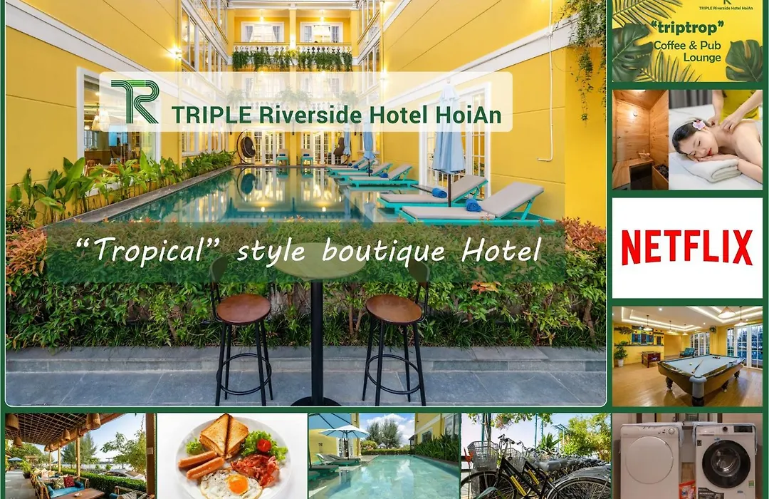 Triple Riverside Villa Hotel Hoian har en bassäng och ligger ca 20 minuters promenad från Hoi An Lune Center. Boendet består av 28 rum. Bland andra bekvämligheter finns 24-timmars reception och rumsbetjäning.
